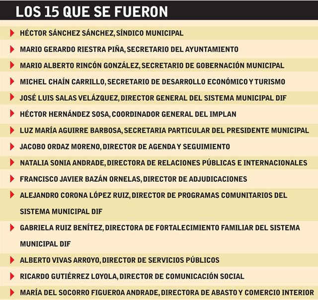 Los funcionarios de primer nivel que decidieron pedir licencia son el síndico Municipal, Héctor Sánchez Sánchez; Mario Riestra Piña, secretario del Ayuntamiento; Michel Chaín Carrillo, secretario de Desarrollo Económico y Turismo; José Luis Salas Velázquez, director general del Sistema Municipal DIF; Héctor Hernández Sosa, coordinador general del IMPLAN, Luz María Aguirre Barbosa, secretaria particular del presidente municipal; y Mario Alberto Rincón González, quien renunció antes de la campaña a la Secretaría de Gobernación Municipal.