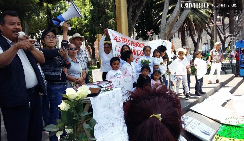 “Militar no dispares, no soy halcón”, se leía en una cartulina que portaba un menor de edad que formó parte de una protesta de habitantes de Palmarito Tochapan en el zócalo de la ciudad de Puebla.