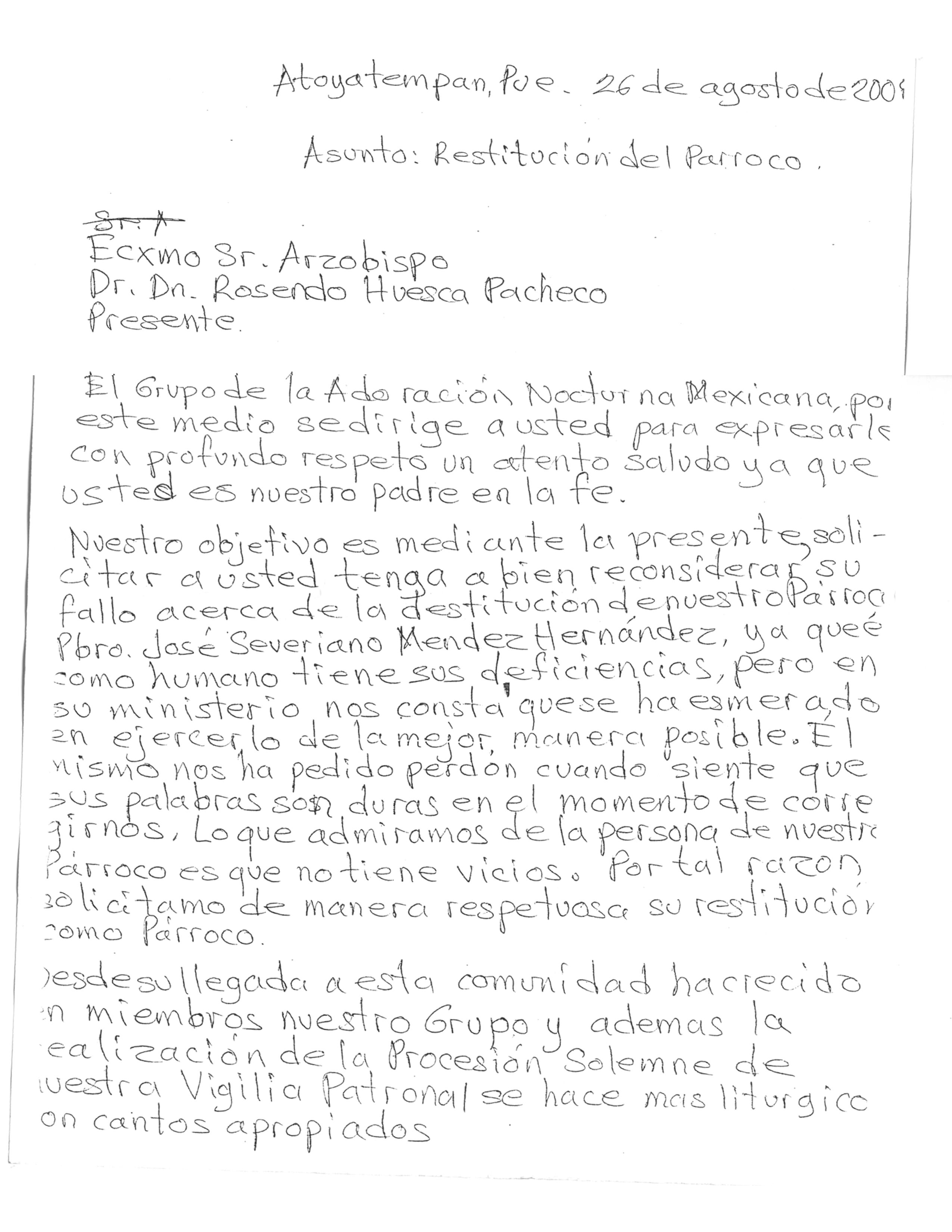 Una  de las cartas firmada por la Comunidad   Parroquial y que le fue remitida a Huesca ayer mismo dice:  “No nos corresponde a nosotros juzgar a nadie, lo único que pedimos a su  señoría es que vea el trasfondo que persigue este grupo de personas (…) asesorados  por Antonio Herrera, excandidato del PRD a diputado por Tepexi.