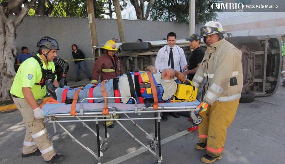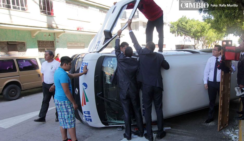 La combi del transporte público volcó sobre el pavimento luego de recibir un impacto frontal de un auto tipo Volkswagen color negro.
