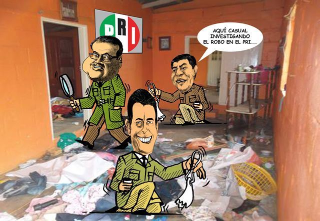 25 de octubre. Tras el saqueo de las oficinas estatales del PRI, los integrantes del dicho instituto entraron en contradicción al declarar versiones diferentes sobre el incidente; la ilustración hace mofa de priistas escandalosos como Mario Marín, Javier Duarte y Humberto Moreira intentando descifrar el crimen.