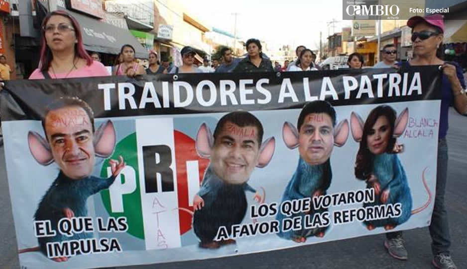 Fueron alrededor de 300 personas las que se dieron cita en las afueras del municipio para después marchar con pancartas y lonas evidenciando fotografías de diversos políticos tanto poblanos como del país con cuerpos de ratas.