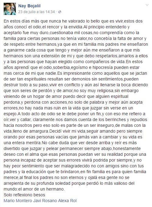 “No hay peor sentimiento que ser malagradecido no con amigos sino con tus padres y la educación que te brindaron, en fin familia es para quien familia merece, al final los padres no son eternos y ojalá esa gente no se arrepienta de su profunda soledad porque perdió lo más valioso del mundo: el amor de un hermano”.