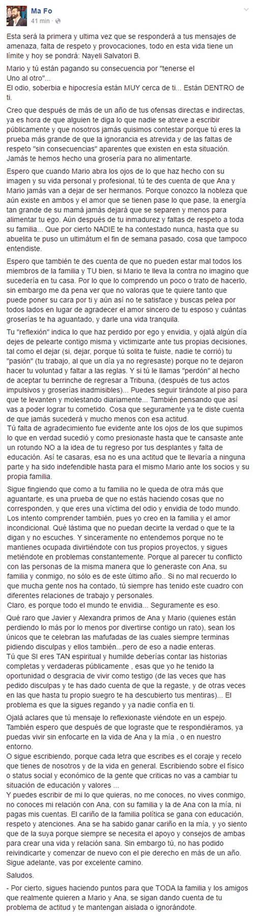 “Tú falta de agradecimiento fue evidente ante los ojos de los que supimos lo que en verdad sucedió y como presionaste hasta que te cansaste ante un rotundo NO a la idea de tu regreso por tus desplantes y falta de educación. Así te casaras, esa no es una actitud que te llevaría a ninguna parte y ha sido indefendible hasta para el mismo Mario ante los socios y su propia familia”.