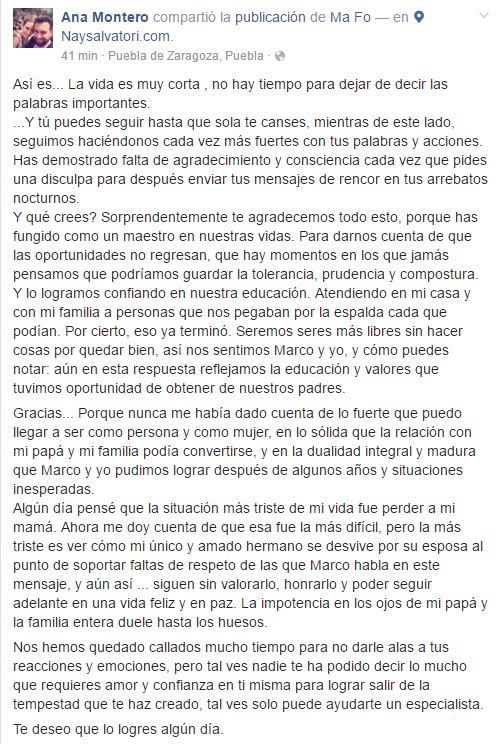 Nay Salvatori inició la guerra el pasado 23 de julio al escribir un post en su Facebook para criticar a su familia política, donde los acusa de abandonar a lo “más valioso del mundo: el amor de un hermano”, al referirse a Mario Montero Rossano.