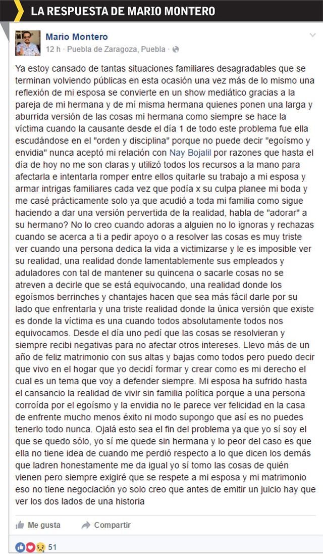 “Nunca aceptó mi relación con Nay Bojalil por razones que hasta el día de hoy no me son claras y utilizó todos los recursos a la mano para afectarla e intentarla romper, entre éstos quitarle su trabajo a mi esposa y armar intrigas familiares”.