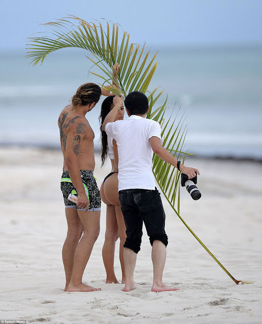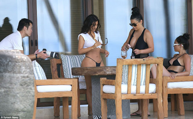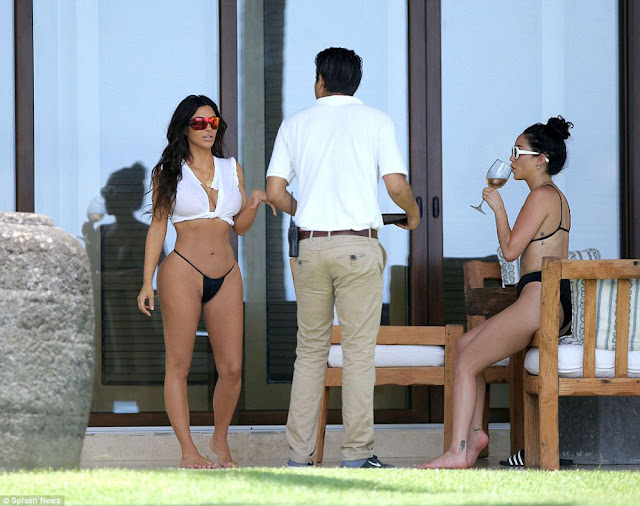 Algunas de las imágenes captadas fueron durante un photoshoot en el que se puede ver a la mayor de las Kardashian presumiendo su figura cerca de la alberca de la villa exclusiva en la que se encuentra.