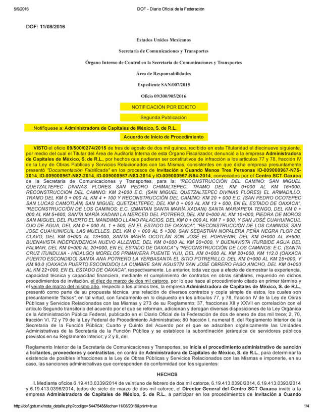 Apenas el 18 de agosto pasado, la SCT dio a conocer un procedimiento contra esta firma por haber presentado documentos apócrifos para ganar la licitación de la modernización de obras de terracería de drenaje, pavimento con concreto hidráulico y obras complementarias en la Carretera federal México-Veracruz. En el expediente SAN/010/2015 quedó evidenciada su inexperiencia para la ejecución de obras por lo que ha recurrido a engaños para ganar licitaciones. Esta investigación que dio a conocer dicha dependencia en el DOF forma parte de otras investigaciones en estados en donde ha resultado beneficiada por la propia SCT.
