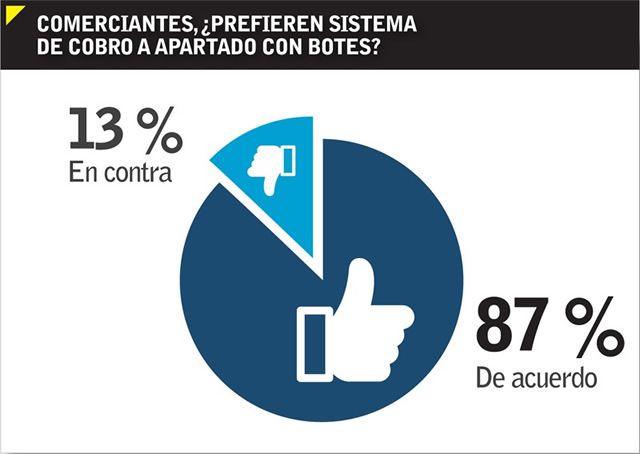 Asimismo, en los sondeos realizadas se afirma que el 80 por ciento de los encuestados son empresarios o comerciantes, mientras que el resto son clientes de estos establecimientos, y de esta muestra el 87 por ciento prefiere que se implemente el sistema de cobro en lugar de cuidar los cajones de estacionamiento con bienes mostrencos, tales como botes.