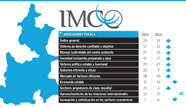 Puebla escaló cuatro posiciones en el Índice de Competitividad Estatal 2016 del Instituto Mexicano para la Competitividad (IMCO), al pasar del peldaño 18 en su edición del 2014 al lugar 14 en la evaluación de este año, siendo el rubro ‘Sectores Precursores de clase mundial’, que incluye sectores financiero, de telecomunicaciones y de transporte, el mejor evaluado para la entidad.