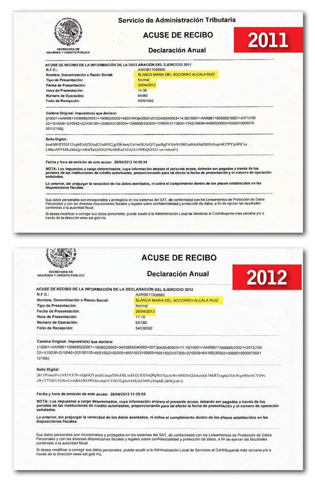 En sus declaraciones de 2011 y 2012, Blanca sólo transparentó las carátulas de los acuses de recibo de su declaración anual, por lo que se presume que se declaró en ceros ante el SAT.