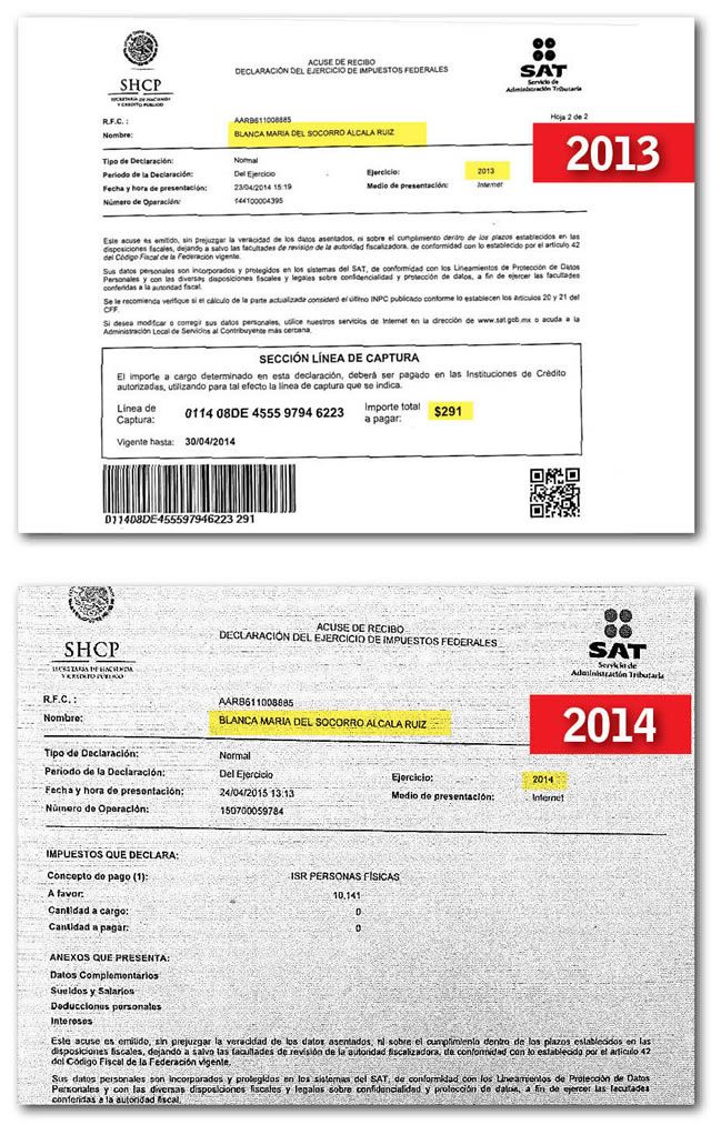 En la declaración fiscal del 2014 —la más actual que presenta— Alcalá Ruiz no pagó un solo peso de impuestos, y hasta tuvo un saldo a favor de 10 mil 141 pesos, aunque también se embolsó 1.8 millones de pesos de sueldo como senadora de la República.