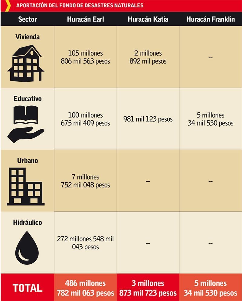 Además de las afectaciones por el fenómeno meteorológico Earl, el Fonden enviará 8 millones 908 mil 253 pesos para la reconstrucción por Franklin y Katia, el pasado 9 de agosto y 9 de septiembre, respectivamente.