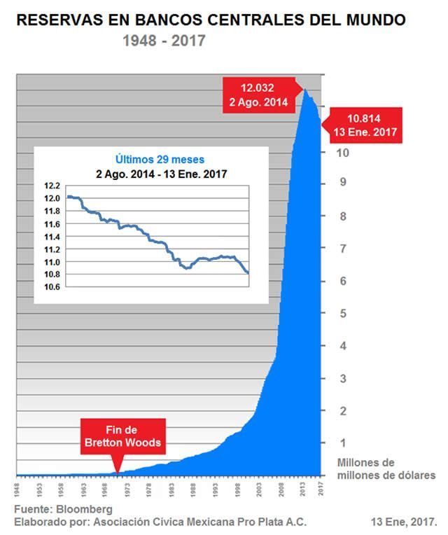 Con cifras de Bloomberg, el empresario Hugo Salinas Price ha calculado en su artículo publicado la semana pasada en Plata.com.mx, que desde el pico alcanzado el 2 de agosto de 2014, dichas reservas cayeron de $12.032 millones de millones de dólares a $10.814 millones de millones de dólares al 13 de enero de 2017.