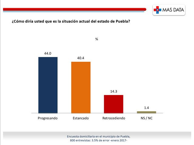 A diferencia de lo ocurrido en 2010, cuando solamente un 22 % creyó que Puebla estaba avanzando, al final del sexenio esa percepción se ha duplicado hasta llegar a 44 %. Además, la percepción de retroceso descendió de 20 a 14 % y la de estancamiento también se redujo del 56 al 40 % durante los últimos seis años.