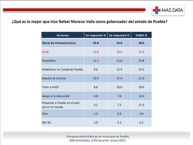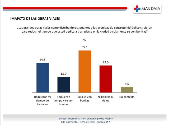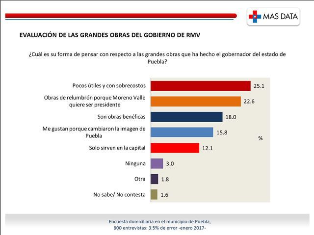 Resulta curioso que si bien lo mejor calificado del sexenio morenovallista son las obras de infraestructura, 1 de cada 4 cree que son poco útiles y con sobrecostos, y otro porcentaje semejante las califica de relumbrón y como parte de la campaña presidencial de Moreno Valle.