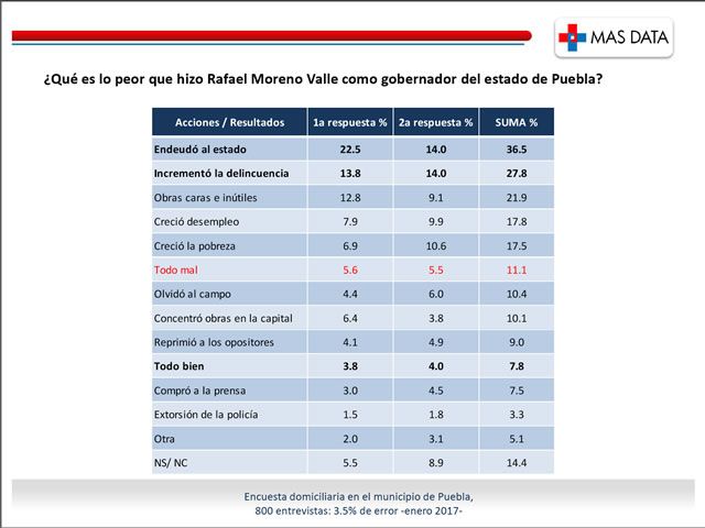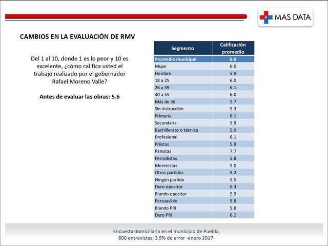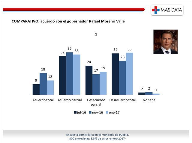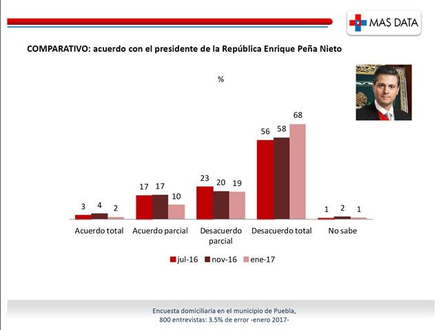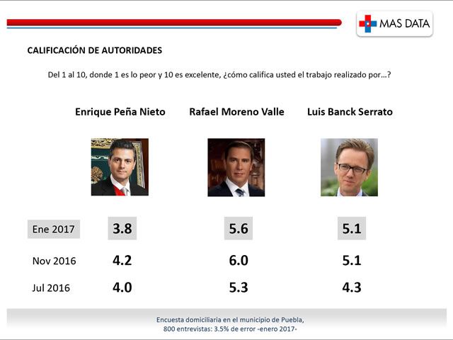 El deterioro en la evaluación gubernamental es ostensible de forma comparativa con mediciones anteriores. Por ejemplo, Peña Nieto pasó de 4.2 de calificación promedio en noviembre del 2016 a 3.8 en enero del 2017 y el gobernador poblano también perdió cuatro décimas al pasar de 6 a 5.6, de acuerdo a la más reciente encuesta en la capital poblana realizada por la firma MAS DATA, a cargo del investigador José Zenteno.