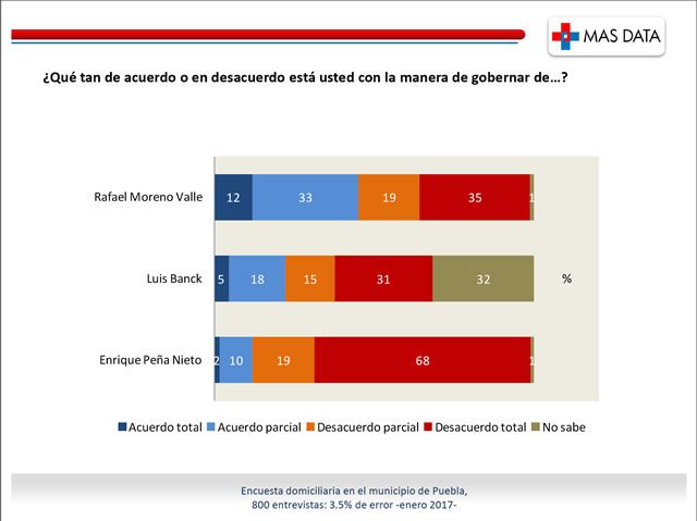 En la recta final de su gobierno y como consecuencia del desencanto provocado por el gasolinazo y el efecto Trump, Rafael Moreno Valle perdió cuatro décimas de calificación y deja la gubernatura con una calificación promedio de 5.6, aunque se mantiene como la autoridad mejor evaluada en la capital del estado, por encima del edil Luis Banck Serrato y muy por arriba de Enrique Peña Nieto, quien toca mínimos históricos para un presidente de México.