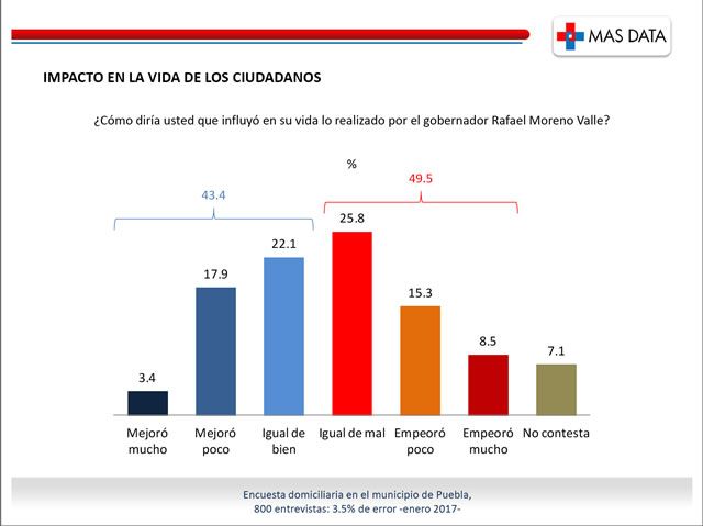Finalmente, el resultado de la gestión morenovallista es altamente polarizante, ya que un 43 % de los encuestados considera que las acciones del sexenio ayudaron a mejorar su vida, mientras que 49 % cree que nada de lo hecho ayudó a mejorar su vida.