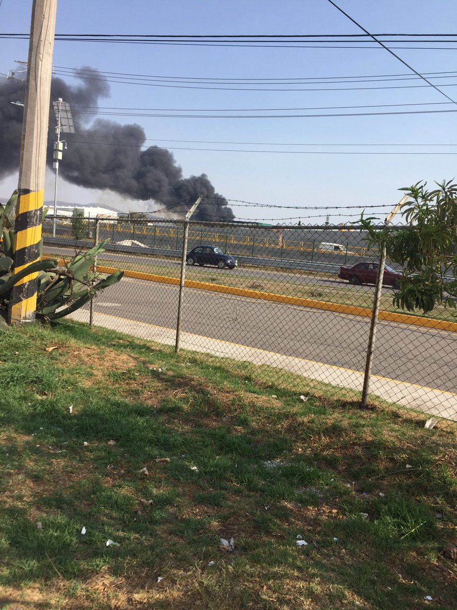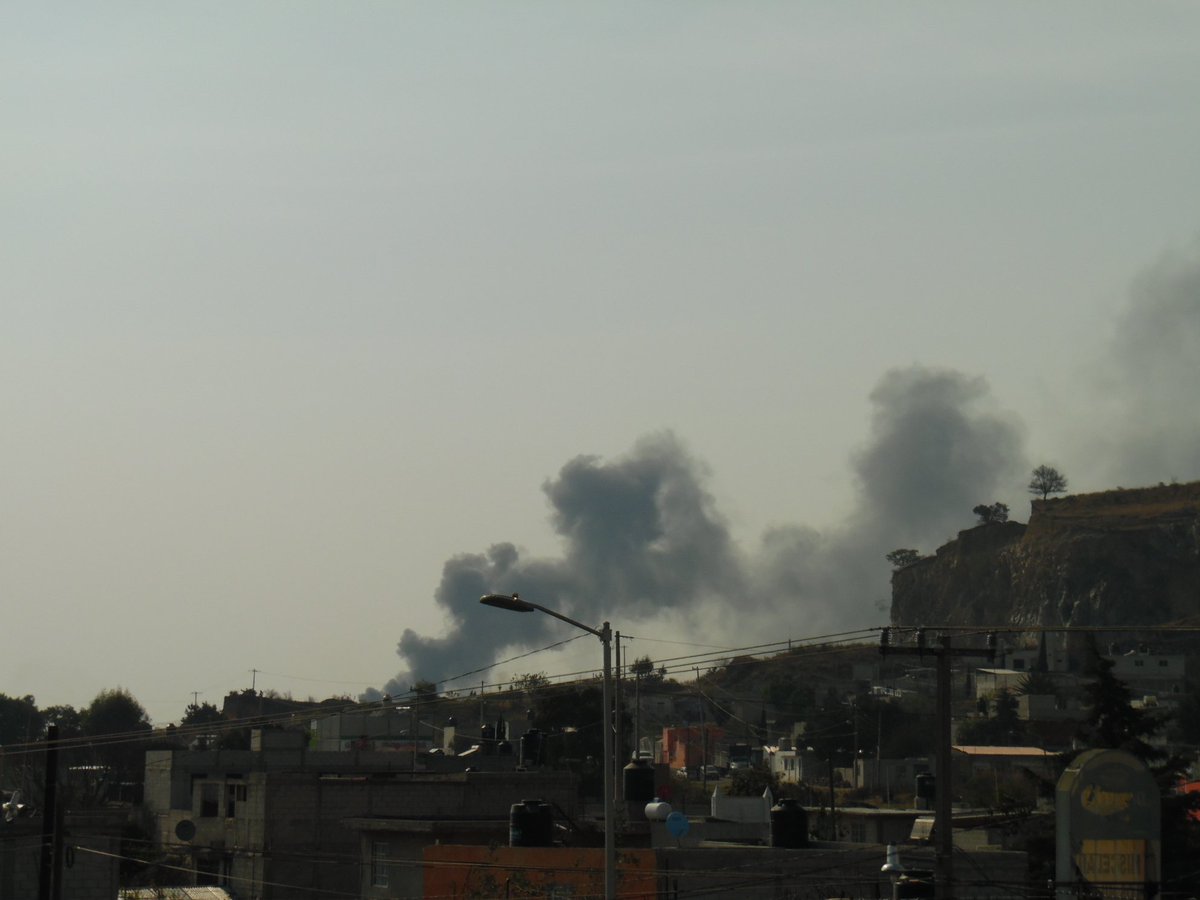 La densa columna de huno negro, es visible desde la autopista México-Puebla. Vecinos de la zona comenzaron a salir de sus casas y esperan el arribo de personal de la paraestatal.
