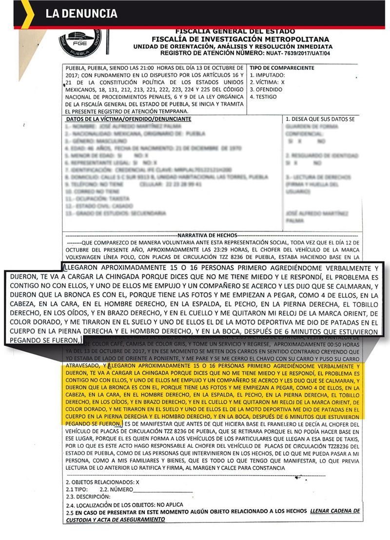 José Alfredo N taxista de la Central de Taxis Estrella Roja Aeropuerto fue golpeado brutalmente por 16 choferes de Uber la madrugada del pasado 13 de octubre luego que le indicara a un conductor de la empresa que no podía realizar base en aquel lugar.