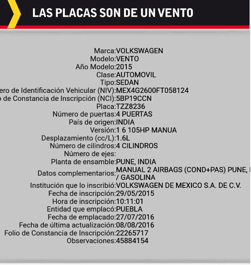Según los registros de Repuve no se tiene ningún reporte de que el Vento o sus placas hayan sido robados.