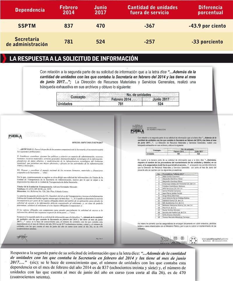 A través de una solicitud de información con el folio 00031417 la SSPTM detalla que la cantidad de unidades que la administración de Gali Fayad recibió del gobierno de Eduardo Rivera Pérez fueron 837, de las cuales al corte de junio sólo se encontraban inventariados 470 vehículos. Es decir, hubo una disminución de 43.9 por ciento (367).
