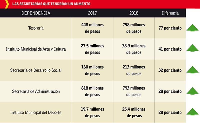 Por su parte a el IMACP, que contó este año con 27.5 millones de pesos en el boceto del Presupuesto de egresos para el 2018, se le está dando un aumento de 11.4 millones de pesos (41 por ciento) para pasar a 38.9 para el ejercicio 2018. En tanto, la Secretaría de Desarrollo Social que contó con 160 millones de pesos, para el próximo año se le planea destinar 213, lo que corresponde a un 32 por ciento más entre ambos periodos.