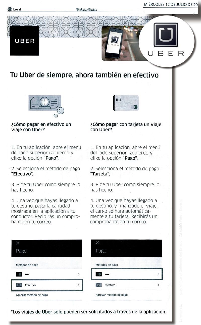 La empresa Uber retó al gobierno de Antonio Gali y a la Secretaría de Infraestructura, Movilidad y Transportes (SIMT), ya que a través de una inserción pagada en El Sol de Puebla promociona el cobro en efectivo para sus viajes, una semana después de que se le prohibió ofrecer dicho servicio e inclusive se incluyó una sanción económica de no acatar la resolución en el Tabulador de Infracciones para el Servicio Público de Transporte.