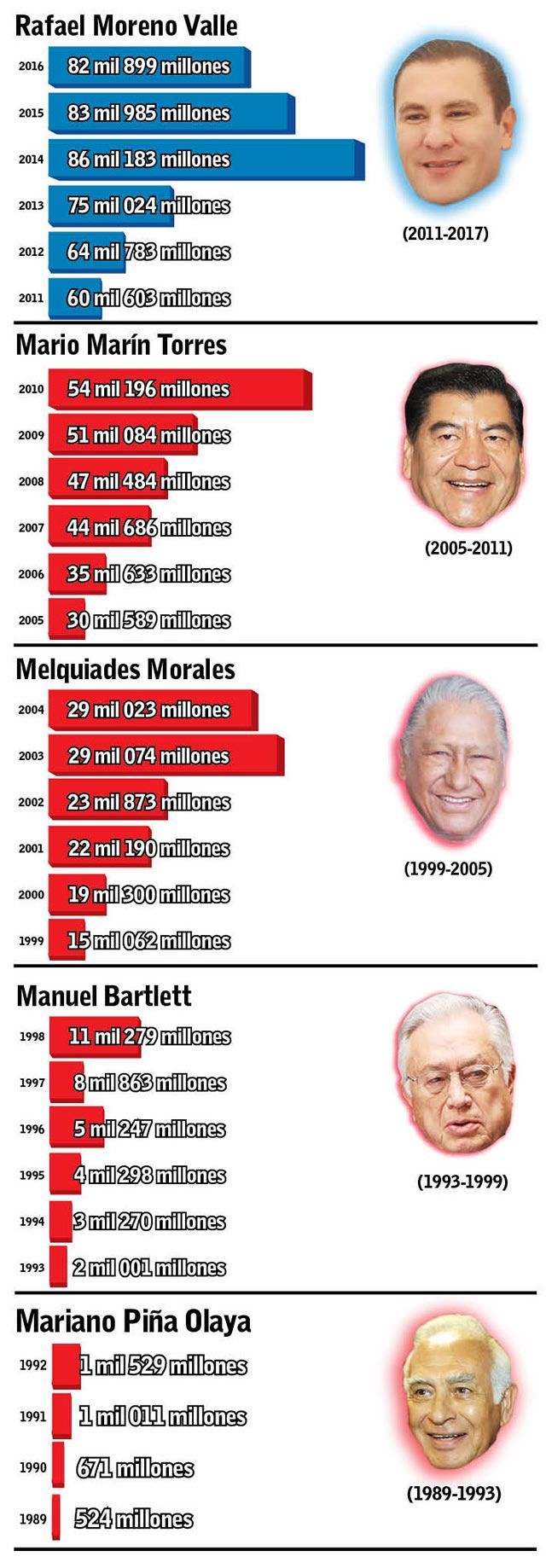 Ni los presupuestos de los últimos tres sexenios priistas y los cuatro últimos años de gobierno de Piña Olaya (1989-1993) son suficientes para alcanzar los recursos que empleó Rafael Moreno Valle en seis años, resultado del incremento del presupuesto federal e ingresos propios.