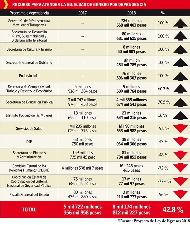 Ante la ola de violencia contra las mujeres que se vive en Puebla que tan sólo en este año ha derivado en 68 feminicidios –reconocidos oficialmente– el gobierno de Antonio Gali Fayad etiquetó 8 mil 174 millones de pesos para atender la igualdad de género en 2018 lo cual representa un 42.8 por ciento más en comparación con los 5 mil 722 millones de pesos destinados para este año, de acuerdo con la Ley de Egresos que ya analiza el Congreso local.