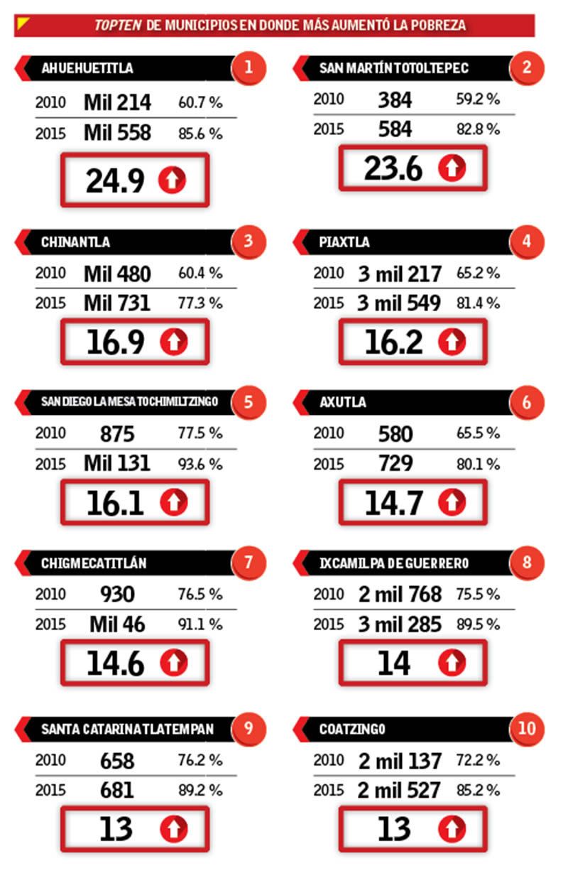 Ahuehuetitla –ubicado en la Mixteca de Puebla– es el municipio en donde más aumentó el número de pobres pues de 2010 a 2015 se registró un incremento de 24.9 por ciento. Le siguió San Martín Totoltepec con un crecimiento del 23.6 por ciento y en el tercer lugar se ubicó Chinantla con un 16.9 por ciento de acuerdo con el último informe del Consejo Nacional de Evaluación de la Política de Desarrollo Social (Coneval).