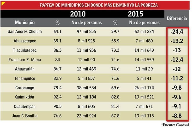 En tanto, entre los municipios donde más han funcionado los programas sociales destaca San Andrés Cholula –gobernado por Leoncio Paisano Arias– ya que redujo el número de pobres en un 24.4 por ciento al pasar de un índice de 64.1 a un 39.7 por ciento.