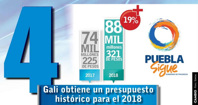 Gracias a sus negociaciones y buenas relaciones que ha entablado el gobernador Antonio Gali con la federación, logró un presupuesto histórico para la entidad al alcanzar una bolsa de 88 mil millones 321 mil pesos que serán destinados al ejercicio fiscal del próximo año, lo que representa una aplicación presupuestal de 19 por ciento respecto a los 74 mil millones 225 mil pesos que la Federación asignó a Puebla durante este año.