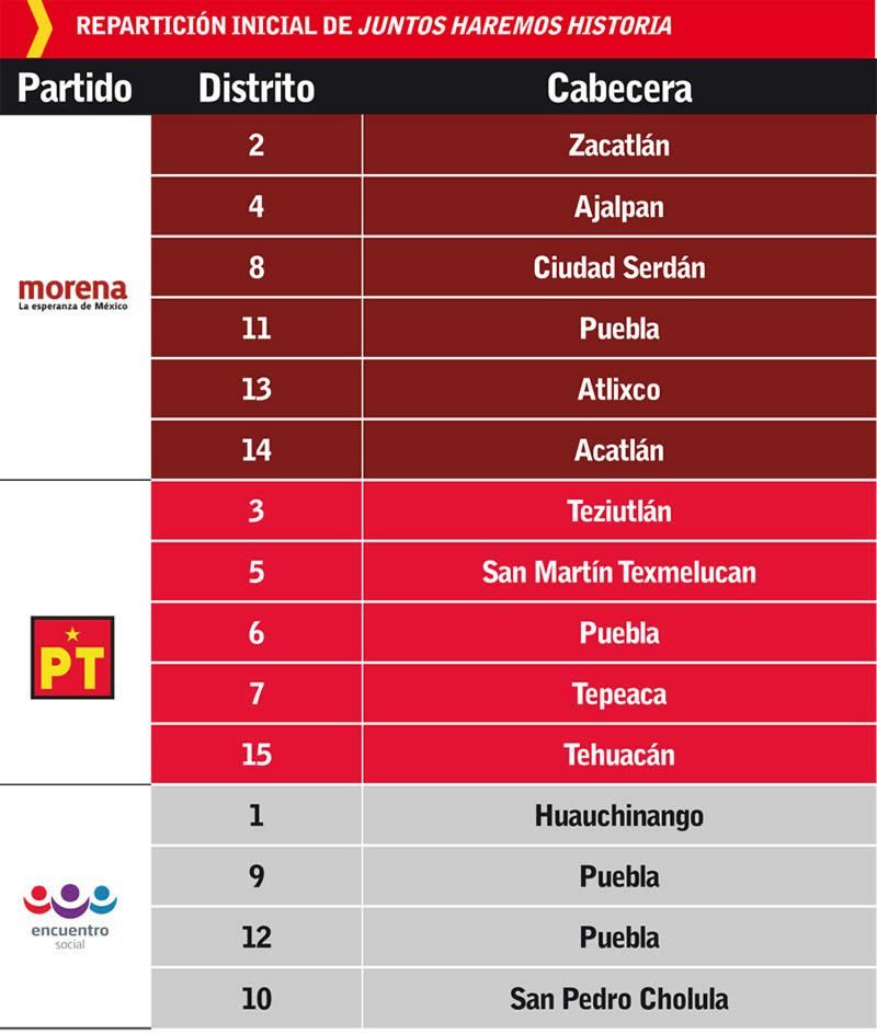 Con ello, Morena sólo encabezará seis candidaturas a diputaciones federales, Zacatlán (distrito 2), Ajalpan (distrito 4), Ciudad Serdán (distrito 8), Puebla (distrito 11), Atlixco (distrito 13) y Acatlán (distrito 14).