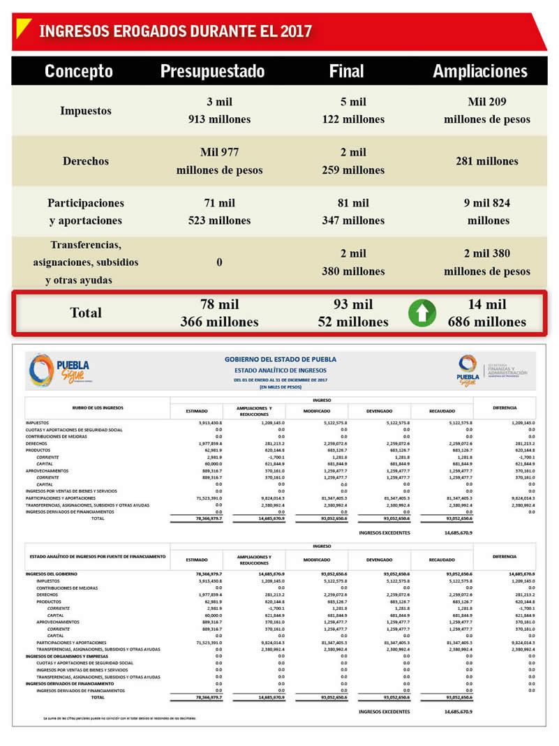 Gracias al cabildeo del mandatario poblano se logró que el Gobierno federal aportara 9 mil 824 millones de pesos más de lo presupuestado a través del rubro ‘participaciones y aportaciones’ al pasar de 71 mil 523 millones de pesos a 81 mil 347 millones.