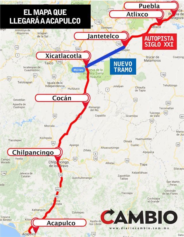 Llegar al puerto de Acapulco tomará a los poblanos alrededor de cuatro horas, en un recorrido de 399 kilómetros aproximadamente. La Secretaría de Comunicaciones y Transportes (SCT) emprenderá la construcción de este proyecto carretero que tendrá como conexión entre la entidad y las costas guerrerenses al municipio de Atlixco, y que será construido por la empresa Pinfra, misma que tiene la concesión de la Atlixcáyotl y el Segundo Piso de la México-Puebla.