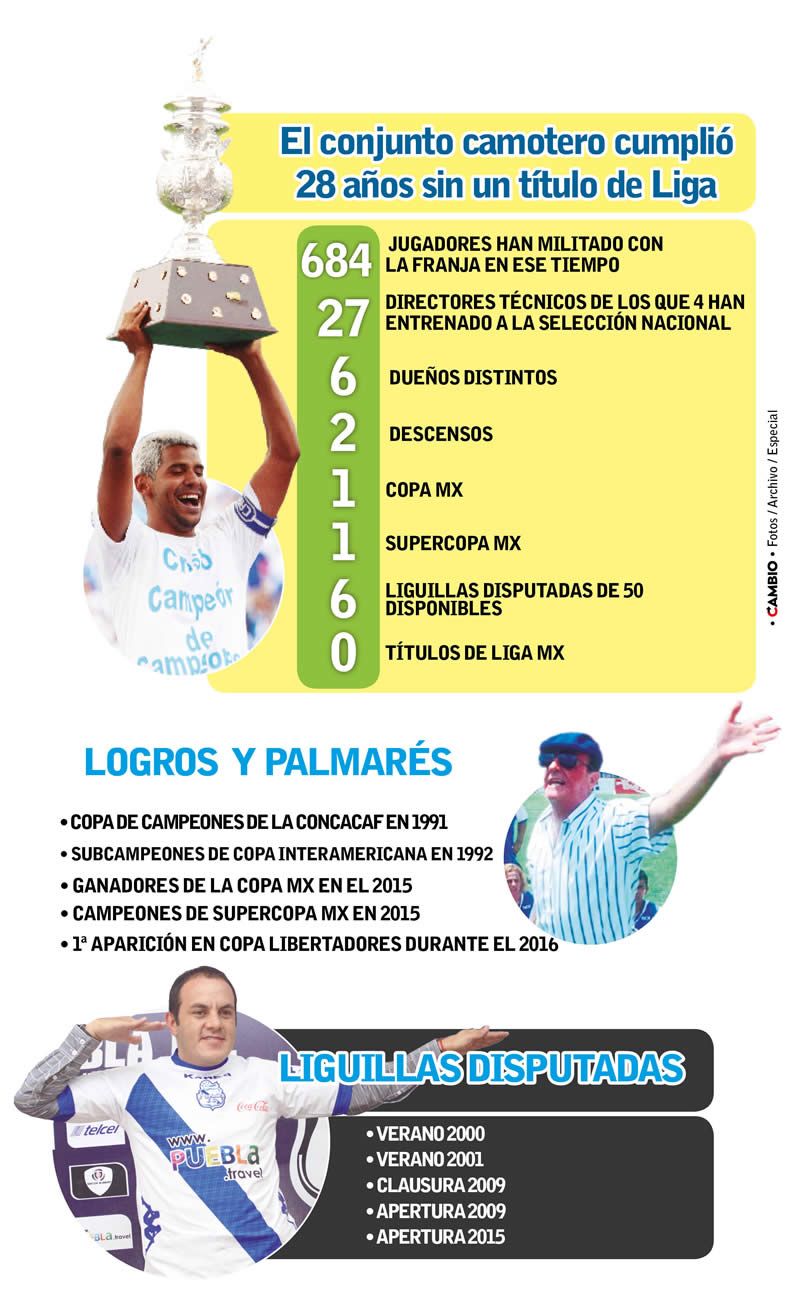 ¿Qué ha pasado con el Club Puebla desde que no es campeón? El conjunto camotero cumplió 28 años sin un título de Liga, y durante ese tiempo han contratado a 684 jugadores, 27 directores técnicos —de esos cuatro han entrenado a la selección nacional—, seis dueños distintos, dos descensos, la obtención de una Copa MX, una Supercopa Mx y seis liguillas disputadas de 50 disponibles, pero ningún título de Liga MX.
