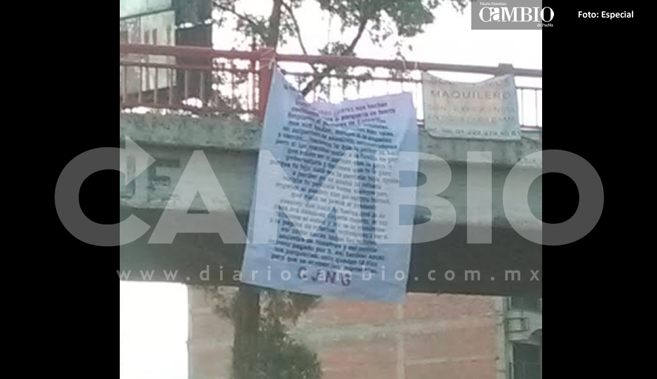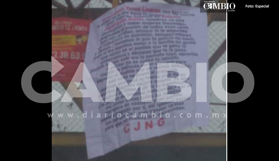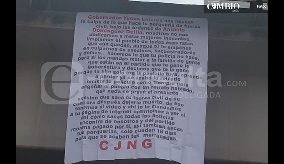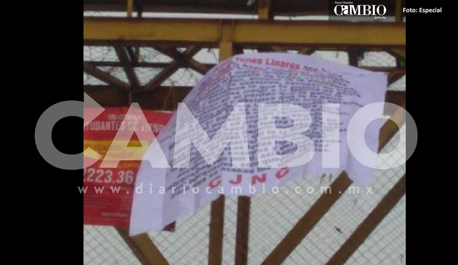 San Martín Texmelucan, Pue. La mañana de este viernes aparecieron cinco mantas con narcomensajes y firmadas por el Cartel de Jalisco Nueva Generación, en los tramos de San Martín Texmelucan, San Pedro Cholula y Puebla.