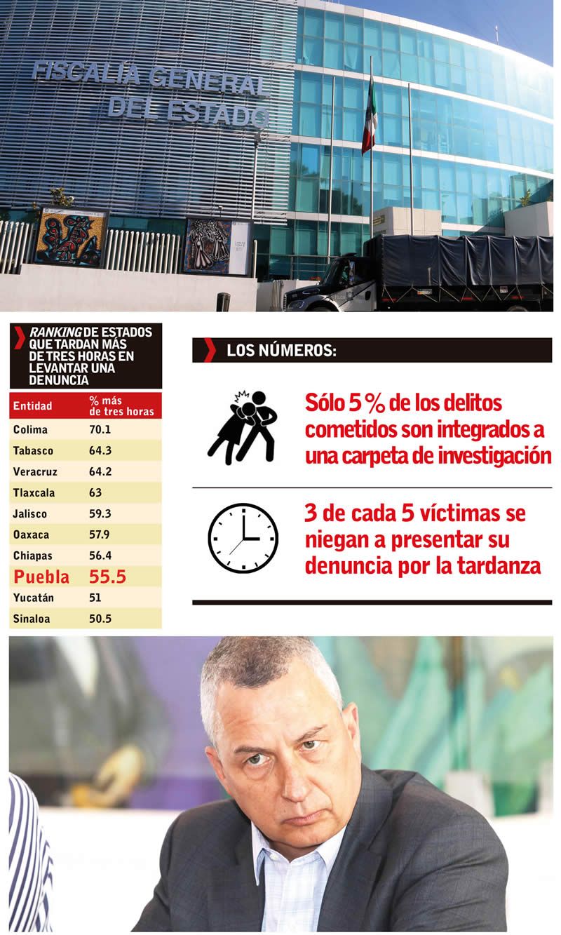 La Encuesta Nacional de Victimización y Percepción sobre Seguridad Pública (Envipe) 2018 confirmó que Víctor Carrancá Bourget dejó la Fiscalía General del Estado (FGE) en ruinas, pues fue catalogada como la octava en la que las víctimas tardan más en presentar su denuncia, ya que el 55 por ciento dilató más de tres horas en dicho proceso, lo que derivó en que tres de cada cinco poblanos no denunciaran algún delito.