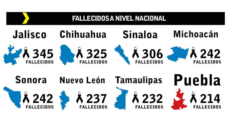Es importante mencionar que los estados con mayor número de fallecidos por accidentes de tránsito en el 2017 fueron: Jalisco con 345, Chihuahua 325, Sinaloa 306, Michoacán 242, Sonora 242, Nuevo León 237, Tamaulipas 232, Puebla 214, Ciudad de México 203 y Guanajuato 197.