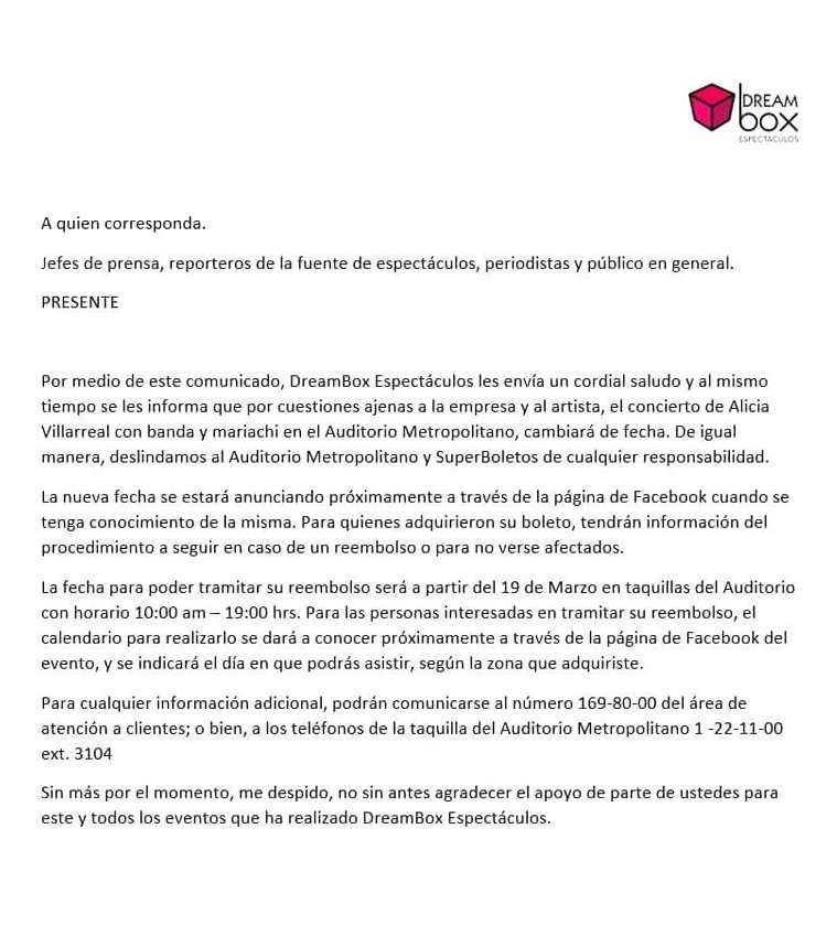 Mediante un comunicado de la empresa Dreambox han dado a conocer que la fecha del concierto de Alicia Villareal con "banda y mariachi" pactada para el viernes 2 de marzo en el Auditorio Metropolitano de la ciudad de Puebla ha sido pospuesta hasta nuevo aviso.