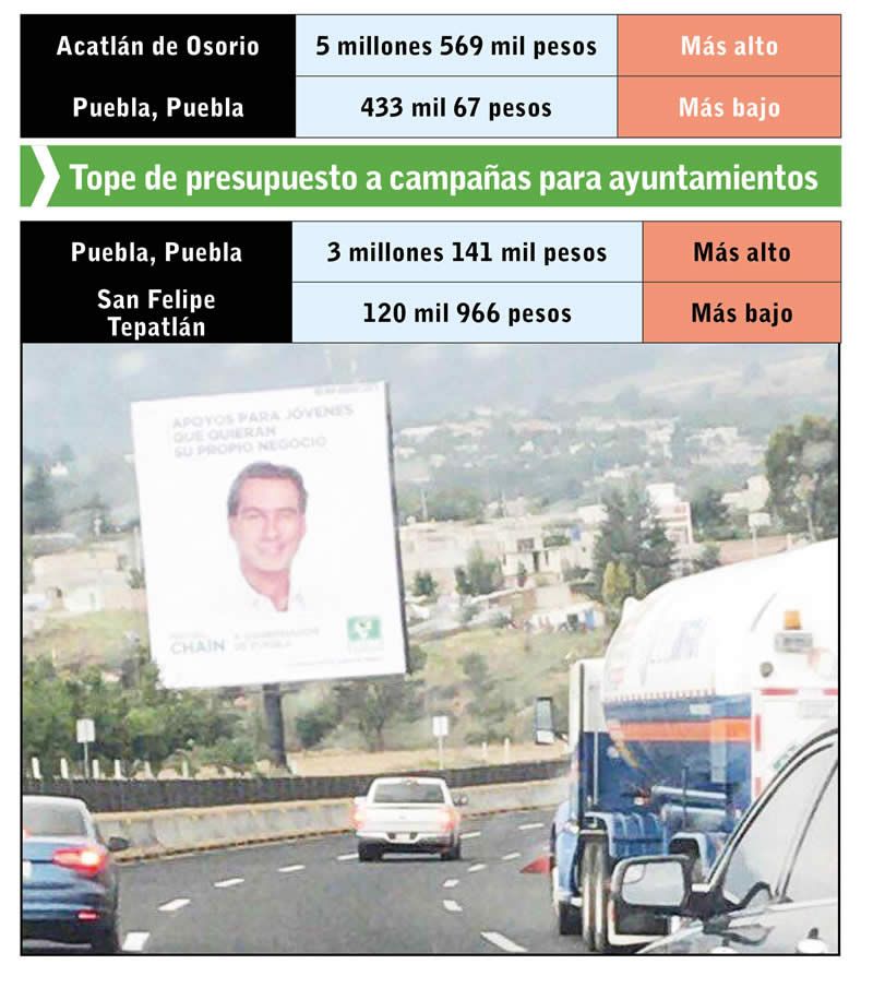 En tanto que para los ayuntamientos, los abanderados de Puebla capital tendrán el tope más alto con 3 millones 141 pesos y el más bajo será para quienes compitan por la alcaldía de San Felipe Tepatlán con 120 mil 966 pesos.