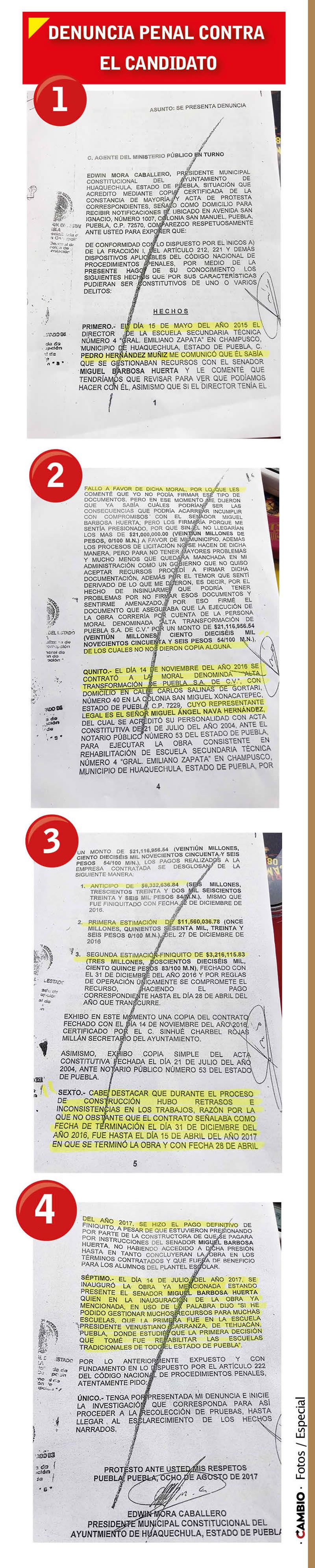 En entrevista para Juego de Troles, el edil de Huaquechula narró que fue el 9 de agosto de 2017 cuando presentó la denuncia ante la Fiscalía Anticorrupción en contra de Miguel Barbosa, luego de que en 2015, al realizar la gestión de recursos para la rehabilitación de la escuela Champusco, fue citado en la Ciudad de México para ceder a través de presiones la licitación para la ejecución de esta obra.