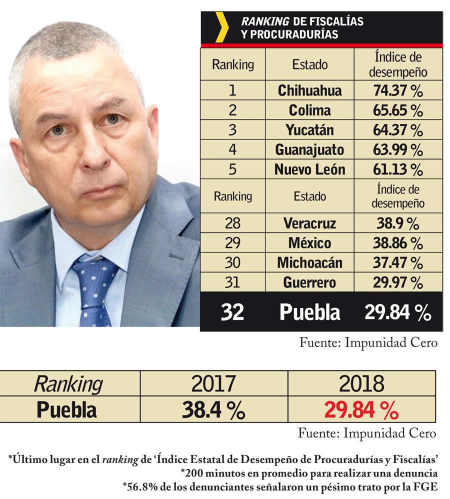 La Fiscalía General del Estado (FGE) de Puebla fue calificada como la peor dependencia de procuración de justicia a nivel nacional, retrocediendo dos lugares en el ranking de índice de desempeño, luego de que en 2017 ocupara la posición número 30 con el 38.4 por ciento, mientras que actualmente se ubica en el último peldaño, con el 29.84 por ciento de efectividad, según el informe de la organización Impunidad Cero.