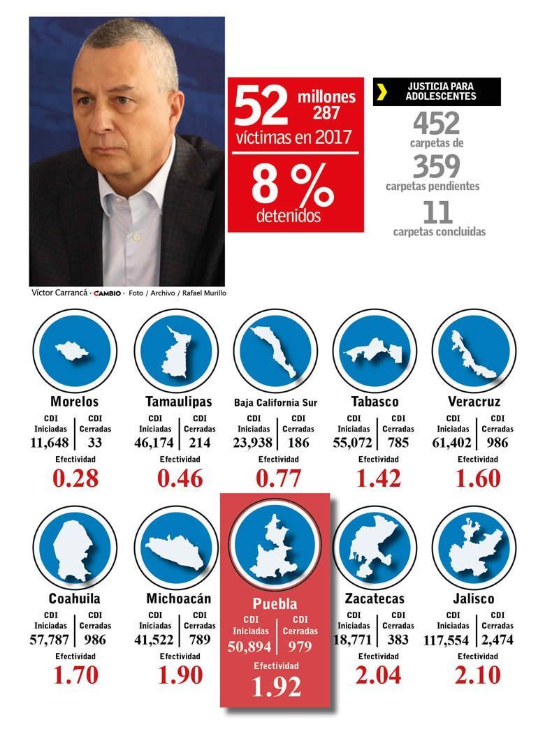 No sólo la Encuesta Nacional de Victimización y Percepción sobre Seguridad Pública (Envipe) 2018 ha señalado que la FGE que abandonó Víctor Carrancá Bourget se encuentra en ruinas, ya que de acuerdo con Censo Nacional de Procuración de Justicia Estatal (CNPJE) de este año, Puebla cuenta con una de las peores fiscalías en cuanto a la efectividad de casos resueltos en relación con el número de carpetas de investigación iniciadas.
