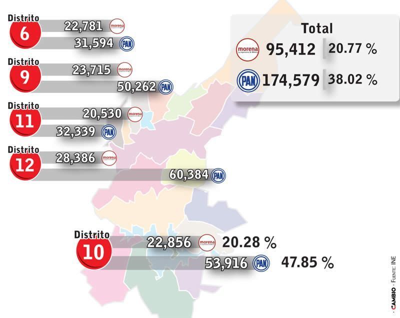 Mientras que con una diferencia de ocho mil 813 votos, el Distrito 6 registró la menor brecha entre los panistas y los morenistas.