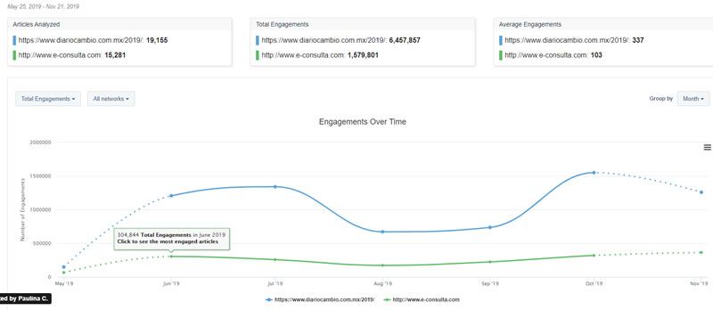 La gráfica del software especializado Buzzsumo.com es nítida respecto de los últimos seis meses: mientras CAMBIO ha obtenido 6.4 millones de interacciones, e-consulta.com sólo 1.5 millones. Es decir, el portal dirigido por Rodolfo Ruiz representa apenas el 20 % del tráfico de este medio.