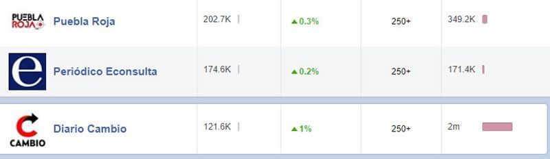 Ahora, en cuestión de tráfico, e-consulta.com se ha desplomado. De acuerdo con un software especializado en medición de impactos informativos, en los últimos seis meses CAMBIO ha arrasado a e-consulta, que pasó de ser “referencia obligada” a colocarse detrás de este rotativo, de El Sol de Puebla y Central. Se ubica en el cuarto lugar.