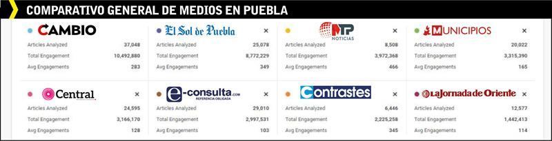 De acuerdo con el software de análisis, MTPnoticias.com fue el tercer portal más visitado de Puebla con 4 millones de impactos en redes sociales, seguido de municipiospuebla.mx, que obtuvo 3.3 millones de impactos en todas las redes sociales.